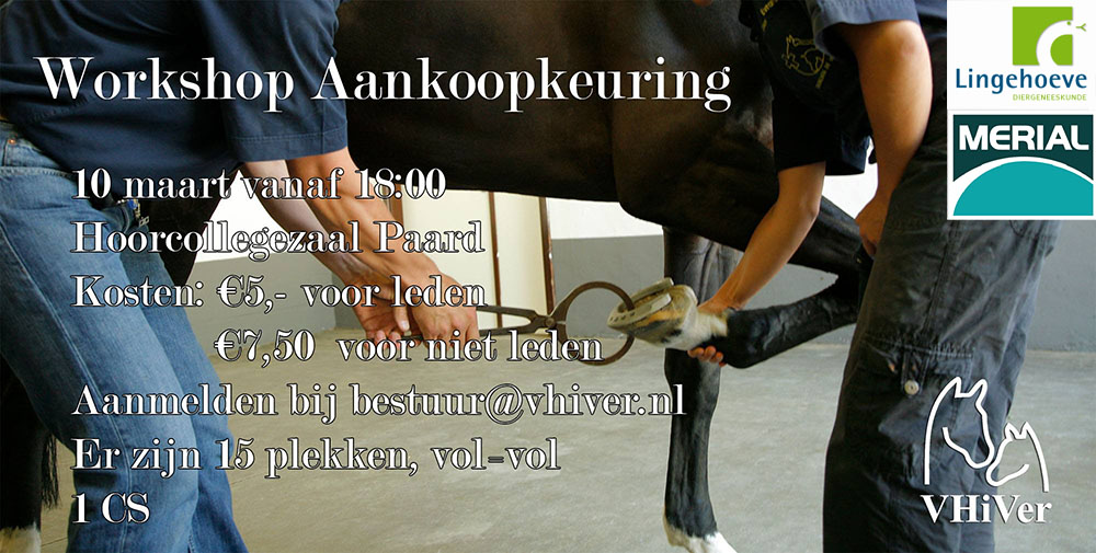 Dinsdagavond 10 maart organiseert de VHiVer weer de aankoopkeuring workshop. Een erg informatieve avond waarbij alle aspecten van een aankoopkeuring aan bod komen. De avond begint met een stukje theorie, waarna we vervolgens aan de slag gaan met twee paarden. Inloop is om 18:00 bij hoorcollegezaal Paard en we starten om 18:30. Kosten zijn €5,- voor leden en €7,50 voor niet leden. Er zijn 15 plekken beschikbaar, dus meld je snel aan door een mailtje te sturen naar be*****@****er.nl